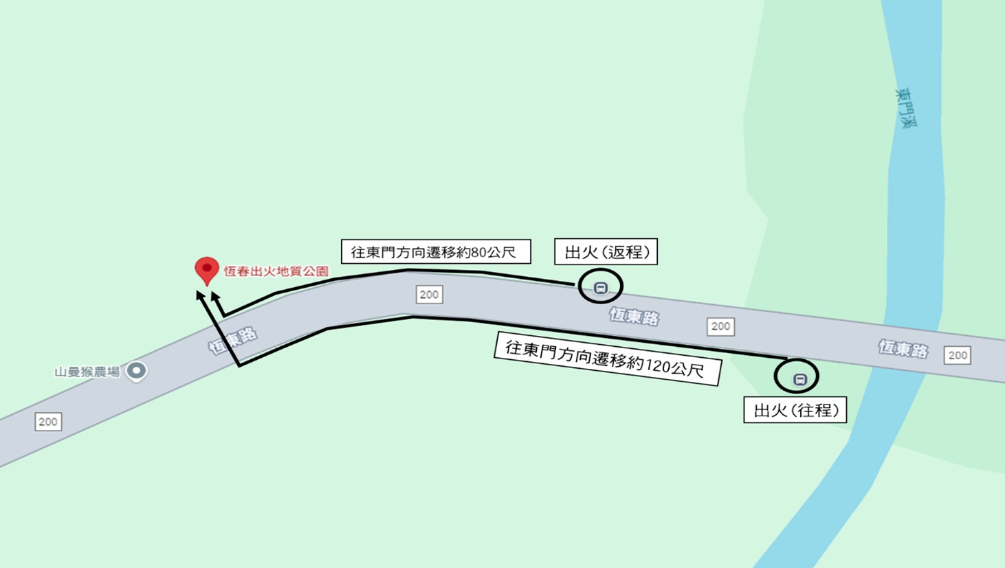- 經(jīng)當(dāng)?shù)馗鳈C(jī)關(guān)單位會勘後,將原「出火」(往、返程)站位均往東門站方向遷移至出火地質(zhì)公園廣場旁候車亭,並更名為「恆春出火地質(zhì)公園」站。(如下圖)